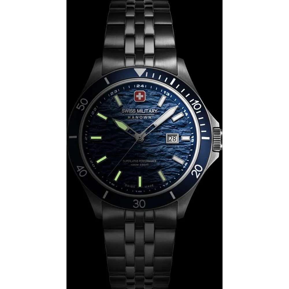 Мужские кварцевые часы Swiss Military Hanowa — швейцарская надёжность в классическом исполнении. Корпус круглый, из нержавеющей стали, диаметром 42 мм. Циферблат — синий с серебристыми стрелками. Стекло — сапфировоеСапфировое стеклоПрочный и надёжный материал из кристалла сапфира синтетического происхождения, характеризующийся особой твёрдостью и устойчивостью к царапинам и повреждениям.. Механизм — швейцарский кварцевый Ronda 505 с функцией **hack** (остановка секундной стрелки для точной настройки). БезельБезельВнешний ободок, закрепляющий стекло. В спортивных часах так называется поворотное кольцо с делениями на циферблате, выполняет роль таймера – замеряет отрезки времени на шкале. Неподвижный безель – элемент декора. Однонаправленно вращающийся безель на дайверских часах позволяет фиксировать моменты погружения и выныривания на поверхность. — неподвижный, из нержавеющей стали с IP-покрытиемIP-покрытиеМетод ионного напыления. Демонстрирует повышенную устойчивость к истиранию, окислению и химическим веществам. Под воздействием высокого давления и температуры около 1500°C молекулы металла надёжно соединяются с частицами корпуса часов.. Задняя крышка — завинчивающаяся. Водонепроницаемость 100 м. Браслет — стальной, на раскладной застёжке с кнопками и фиксаторомРаскладная застёжкаТакой тип застёжки используется только на браслетах из металла. Она никогда не раскрывается полностью, происходит разделение на 2 и более частей. Раскладывающая застёжка снизит вероятность потери часов к минимуму.. Идеальный выбор для тех, кто ценит швейцарское качество и классический стиль.