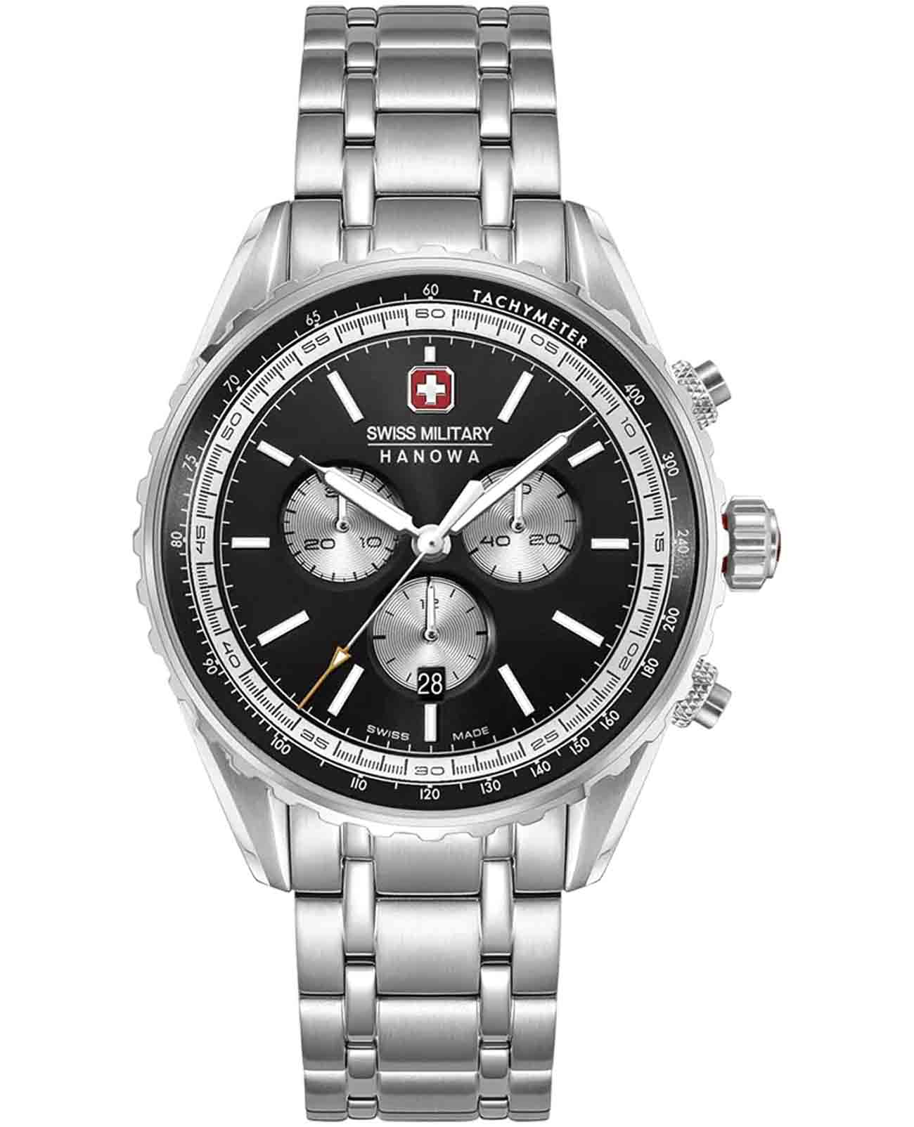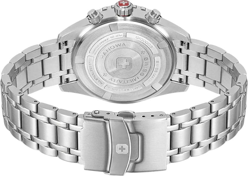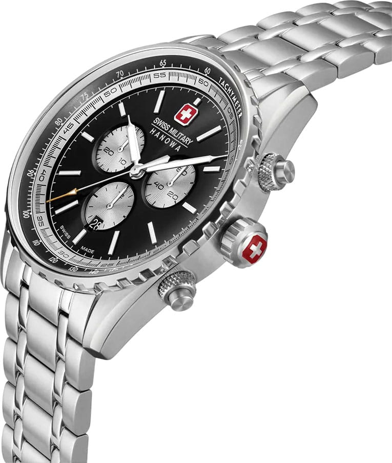 Мужские швейцарские часы Swiss Military Hanowa Afterburn Chrono SMWGI0000309 с хронографомХронографФункция позволяет измерять отрезки времени с особой точностью: часы, минуты, секунды. Верным признаком хронографа является наличие на циферблате 3 дополнительных окошек-счётчиков. и секундомеромСекундомерСекундоме́р — прибор, способный измерять интервалы времени с точностью до долей секунды.. Сапфировое стеклоСапфировое стеклоПрочный и надёжный материал из кристалла сапфира синтетического происхождения, характеризующийся особой твёрдостью и устойчивостью к царапинам и повреждениям. с антибликовым покрытием защищает циферблат от царапин и обеспечивает отличную читаемость при любом освещении. Корпус из нержавеющей стали диаметром 44 мм сбалансирован и элегантен. Браслет с раскладной застёжкойРаскладная застёжкаТакой тип застёжки используется только на браслетах из металла. Она никогда не раскрывается полностью, происходит разделение на 2 и более частей. Раскладывающая застёжка снизит вероятность потери часов к минимуму. идеально дополняют дизайн часов, обеспечивая комфортное ношение. Люминесцентное покрытиеЛюминесцентное покрытиеПозволяет считывать показания времени в темноте. Производители наносят на стрелки, часовые индексы, безель или поверхность циферблата светонакопительный состав, дающий холодное свечение. стрелок и меток позволит вам следить за временем даже в полной темноте. Стальной безельБезельВнешний ободок, закрепляющий стекло. В спортивных часах так называется поворотное кольцо с делениями на циферблате, выполняет роль таймера – замеряет отрезки времени на шкале. Неподвижный безель – элемент декора. Однонаправленно вращающийся безель на дайверских часах позволяет фиксировать моменты погружения и выныривания на поверхность. с PVD-покрытиемPVDУльтратонкое покрытие наносится в технике вакуумного напыления, сочетает в себе нитрид титана особой прочности со слоем золота или оксида хрома. Несёт в себе декоративную или защитную функцию.. Часы оснащены центральной секундной стрелкой и окошком даты в положении «6 часов», что делает их функциональными для повседневного использования. ТахиметрТахиметрРазмеченная шкала, располагается на ободке или безеле часов. Тахиметр позволяет рассчитать скорость на определённом участке пути, расстояние измеряется в километрах или милях. по внешнему краю. Водонепроницаемость до 100 метров. Идеальный выбор для тех, кто ценит качество и долговечность.
