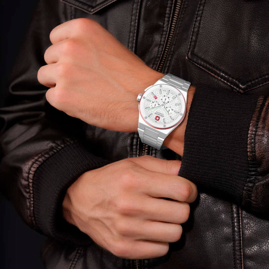 Мужские швейцарские часы-хронографХронографФункция позволяет измерять отрезки времени с особой точностью: часы, минуты, секунды. Верным признаком хронографа является наличие на циферблате 3 дополнительных окошек-счётчиков. Swiss military hanowa Sidewinder Ceramic SMWGI0002284, кварцевый механизм с высокой точностью. Сапфировое стеклоСапфировое стеклоПрочный и надёжный материал из кристалла сапфира синтетического происхождения, характеризующийся особой твёрдостью и устойчивостью к царапинам и повреждениям. устойчивое к появлению царапин, обладающее высокой прозрачностью. Класс водозащиты: 100 метров, позволит плавать, нырять и заниматься другими водными видами спорта. Корпус часов изготовлен из керамики. Керамический браслет с застёжкой «бабочка» с кнопкамиЗастёжка "бабочка"Такой вид застёжки дополняется предохранителями, помогающими избежать случайного раскрытия браслета. Обладают изящным исполнением. .