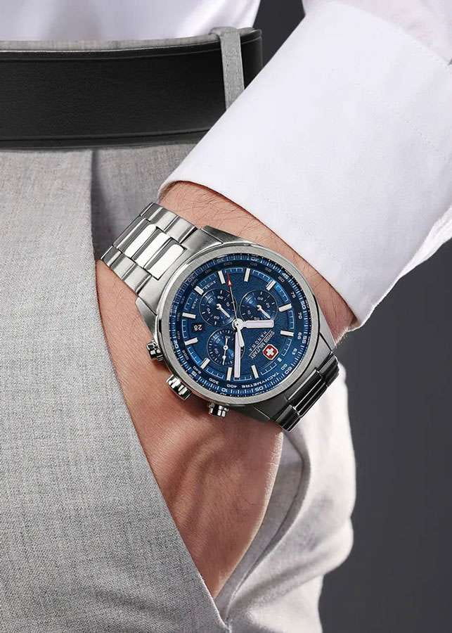 Мужские швейцарские часы Swiss Military Hanowa SMWGI0004205 – это элегантные часы, сочетающие в себе классический дизайн и современную функциональность. Корпус из нержавеющей стали диаметром 43 мм сбалансирован и элегантен. Сапфировое стеклоСапфировое стеклоПрочный и надёжный материал из кристалла сапфира синтетического происхождения, характеризующийся особой твёрдостью и устойчивостью к царапинам и повреждениям. с антибликовым покрытием защищает циферблат от царапин и обеспечивает отличную читаемость при любом освещении. Браслет с раскладной застёжкойРаскладная застёжкаТакой тип застёжки используется только на браслетах из металла. Она никогда не раскрывается полностью, происходит разделение на 2 и более частей. Раскладывающая застёжка снизит вероятность потери часов к минимуму. идеально дополняют дизайн часов, обеспечивая комфортное ношение. Люминесцентное покрытиеЛюминесцентное покрытиеПозволяет считывать показания времени в темноте. Производители наносят на стрелки, часовые индексы, безель или поверхность циферблата светонакопительный состав, дающий холодное свечение. стрелок и меток позволит вам следить за временем даже в полной темноте. Циферблат с точным механизмом хронографаХронографФункция позволяет измерять отрезки времени с особой точностью: часы, минуты, секунды. Верным признаком хронографа является наличие на циферблате 3 дополнительных окошек-счётчиков. и хорошо заметным индикатором даты в положении между 4 и 5 часов. ТахиметрТахиметрРазмеченная шкала, располагается на ободке или безеле часов. Тахиметр позволяет рассчитать скорость на определённом участке пути, расстояние измеряется в километрах или милях. по внешнему краю. Водонепроницаемость до 100 метров хорошо подходят для повседневного ношения и занятий водными видами спорта.