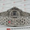 Перламутровый циферблат декорирован 12 бриллиантами в 0,0456 карат, один только взгляд на изысканную модель заставляет появиться праздничное настроение. Наручные часы с автоподзаводом оснащены высокоточным калибром ETA 2671 с запасом хода 38 часов. Прозрачная задняя крышка позволяет следить за завораживающим движением деталей и шестерёнок. Сапфировое стекло препятствует появлению царапин. Водостойкость до 3 бар. . Отображение текущего числа. Габариты: 29 x 29 x 9 мм.