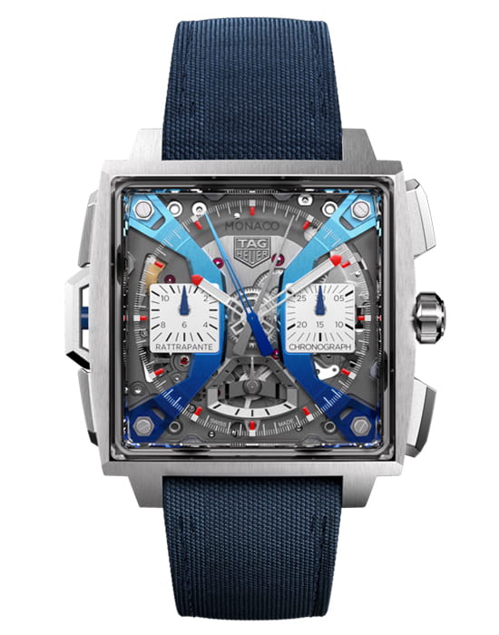 Мужские наручные часы-хронографХронографФункция позволяет измерять отрезки времени с особой точностью: часы, минуты, секунды. Верным признаком хронографа является наличие на циферблате 3 дополнительных окошек-счётчиков. TAG Heuer Monaco Split-seconds Chronograph CBW2182.FC8339. Корпус изготовлен из титана. Стрелки с люминесцентным покрытиемЛюминесцентное покрытиеПозволяет считывать показания времени в темноте. Производители наносят на стрелки, часовые индексы, безель или поверхность циферблата светонакопительный состав, дающий холодное свечение. и накладные часовые метки позволяют точно определять время. Циферблат защищает выпуклое сапфировое стеклоСапфировое стеклоПрочный и надёжный материал из кристалла сапфира синтетического происхождения, характеризующийся особой твёрдостью и устойчивостью к царапинам и повреждениям. со скошенной кромкой. Стальной корпус диаметром 39 мм с прозрачной задней крышкой гарантирует водонепроницаемость на глубине 100 метров. Тканевый ремешок.