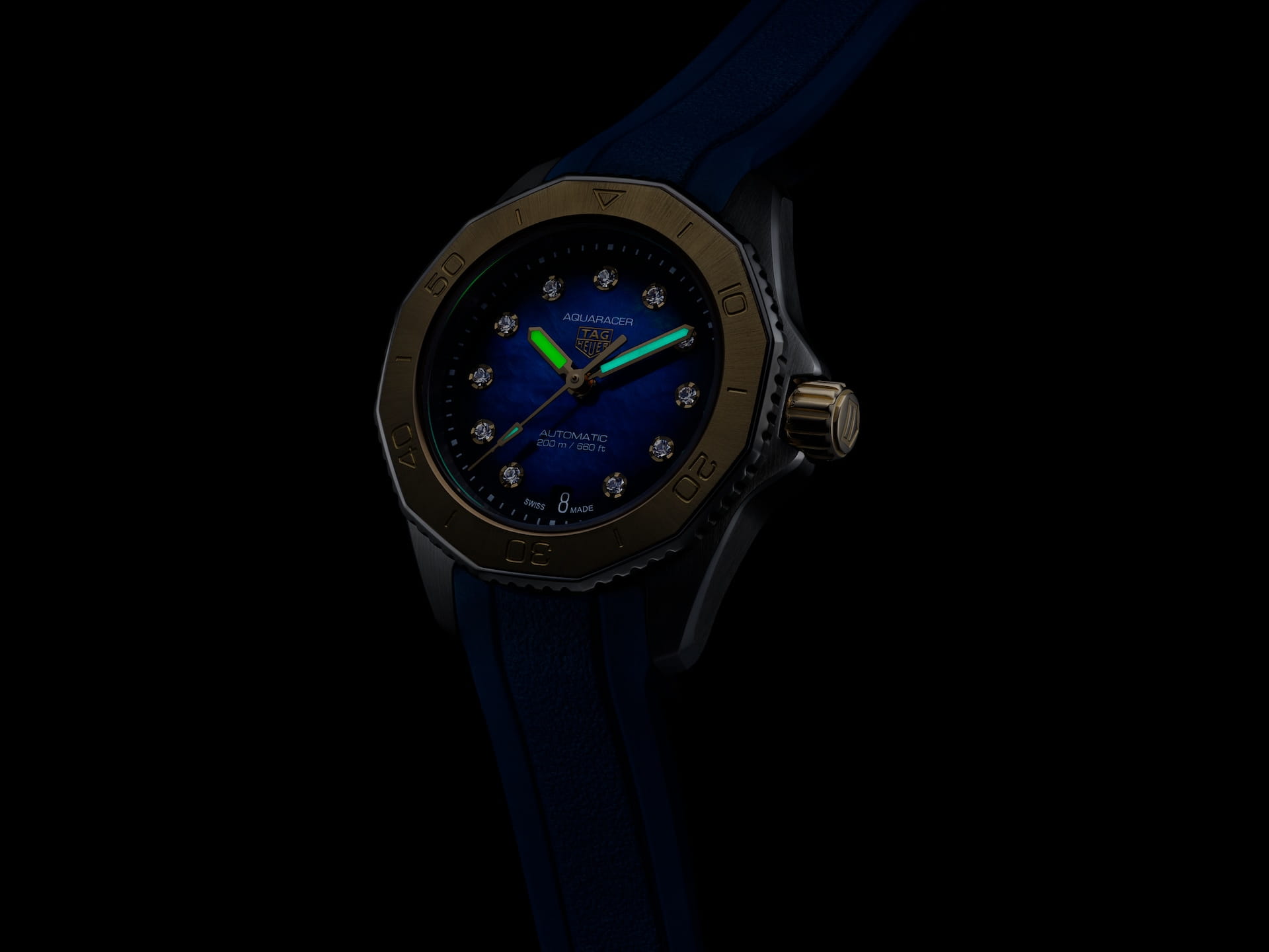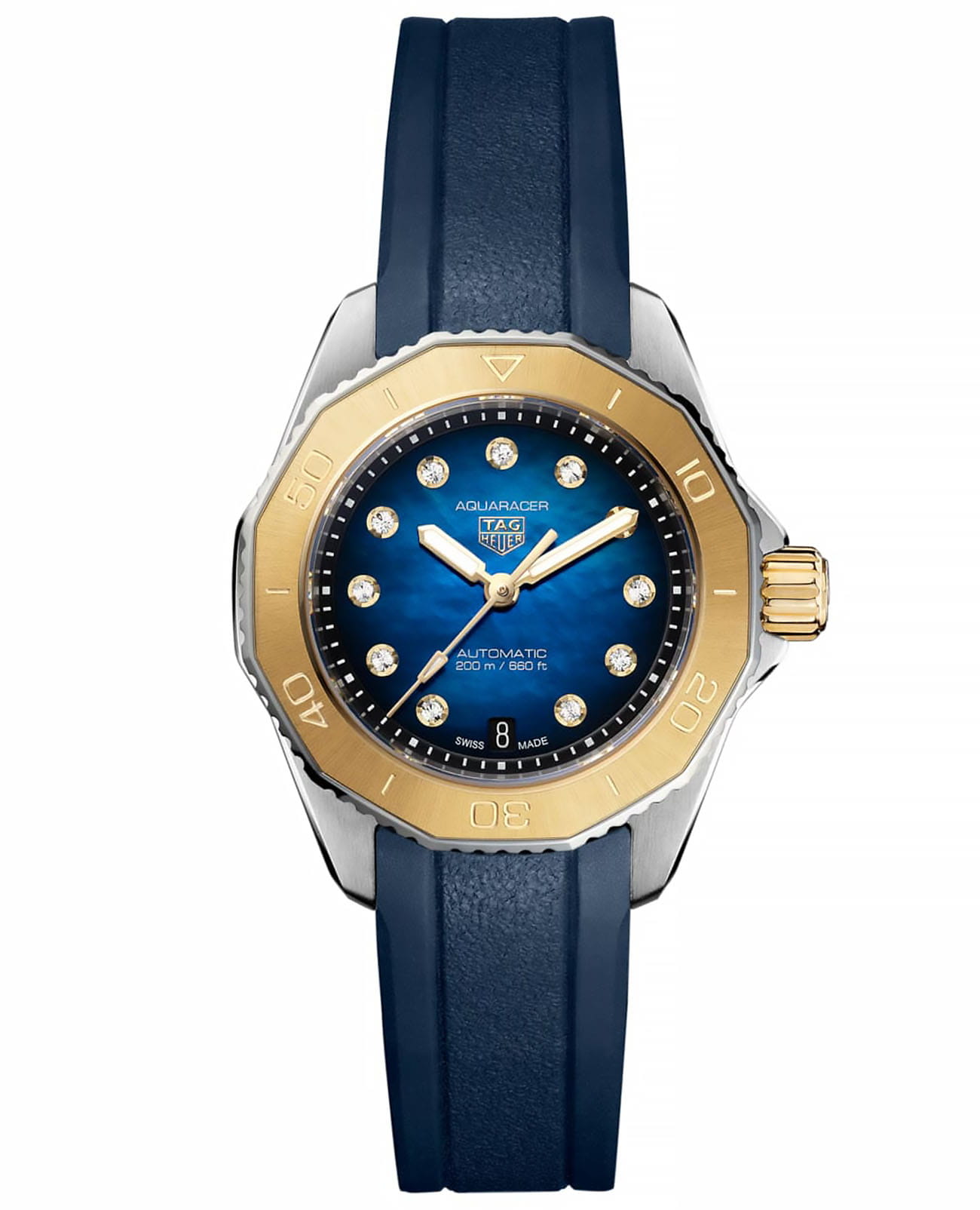 Часы TAG Heuer Aquaracer Professional 200 WBP2450.FT6215. Сочетая в себе прочность желтого золота и универсальность синего каучукового ремешка, этот роскошный TAG Heuer Aquaracer отличается спортивной элегантностью. Сверкающие бриллианты диаметром 1,4 мм (0,107 карата). Очень разборчивые благодаря светящимся позолоченным стрелкам и индексам, великолепно контрастирующим с темно-синим циферблатом, эти эффектные часы готовы к крайностям.