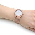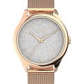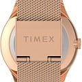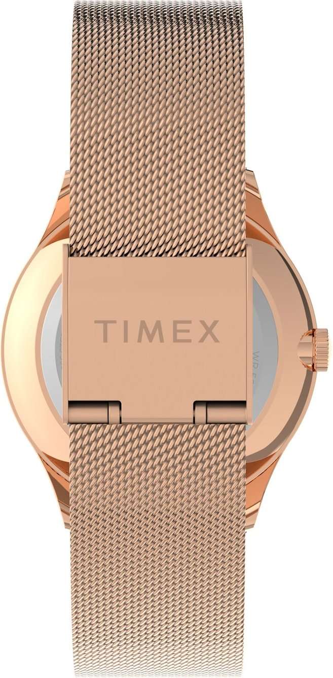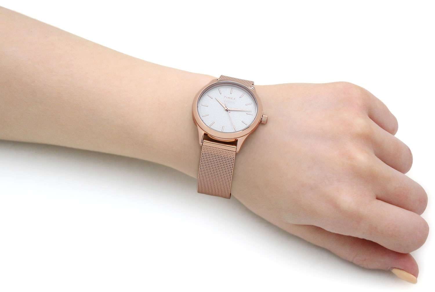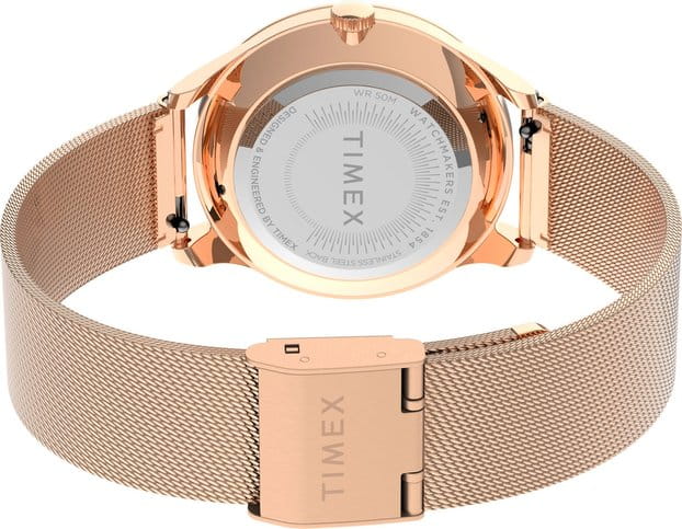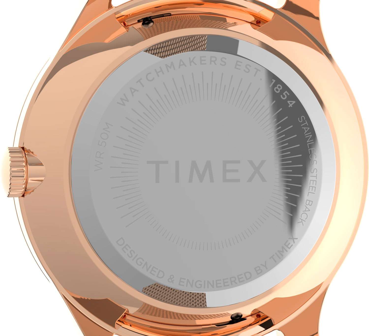 Наручные часы Timex TW2V01400 — это изысканный аксессуар, который станет завершающим штрихом в образе современной амбициозной девушки с утонченным вкусом. Эта модель из США сочетает в себе стиль и функциональность, предлагая кварцевый механизм для надежной точности. Корпус часов выполнен из латуни с розовым PVDPVDУльтратонкое покрытие наносится в технике вакуумного напыления, сочетает в себе нитрид титана особой прочности со слоем золота или оксида хрома. Несёт в себе декоративную или защитную функцию.  покрытием, придающим изделию элегантность и современный вид. Серебристый циферблат с эффектом Glitter украшен узкими клиновидными стрелками в стиле Dauphine и метками в виде штрихов, что обеспечивает легкость считывания времени. Рифленая заводная головка добавляет утонченности и завершенности дизайну. Стальной миланский браслет с розовым PVDPVDУльтратонкое покрытие наносится в технике вакуумного напыления, сочетает в себе нитрид титана особой прочности со слоем золота или оксида хрома. Несёт в себе декоративную или защитную функцию. покрытием не только удобен, но и надежен благодаря регулируемом раскладном замкеРаскладной замокДанный вариант застежки используется только на часах с металлическим браслетом. Отличительная особенность такого крепления в том, что длина браслета становится универсальной и вы можете самостоятельно отрегулировать нужный вам размер – застежка просто двигается по браслету часов., который обеспечивает комфортную посадку на запястье. Водозащита 50WR делает часы устойчивыми к влаге, что позволяет использовать их в различных условиях. Минеральное стеклоМинеральное стеклоМинеральное стекло представляет собой искусственно выращенный минерал кварца. Такое стекло отличается особой устойчивостью к повреждениям и царапинам. Уступает по некоторым качествам сапфировому стеклу. защищает циферблат от царапин и повреждений, сохраняя его первоначальный вид. Диаметр корпуса составляет 32 мм, а ширина браслета — 16 мм, что делает часы изящными и подходящими для любого случая.