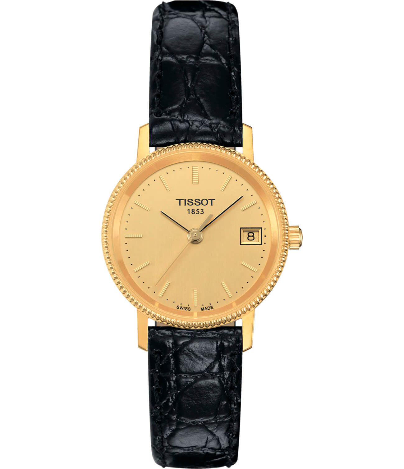 TISSOT T71311521 - женские кварцевые золотые наручные часы Корпус этих часов небольшого размера (24 мм) и выполнен из 18-каратного желтого золота  Модель TISSOT T71311521 имеет устойчивое к царапинам сапфировое стекло, кожаный ремешок , цвет циферблата шампань Калибр механизма: ETA E61111 Класс водозащиты: 30 м /3 АТМ Дополнительные функции и особенности: отображение числа Полная заводская комплектация TISSOT: оригинальные часы, фирменная коробка, инструкция, сервисная книжка, роман о часовой фабрике, миникаталог, замшевый фирменный чехол черного цвета для хранения и/или переноски часов, кассовый и товарный чеки Международная гарантия 2 года Производство и сборка: Швейцария