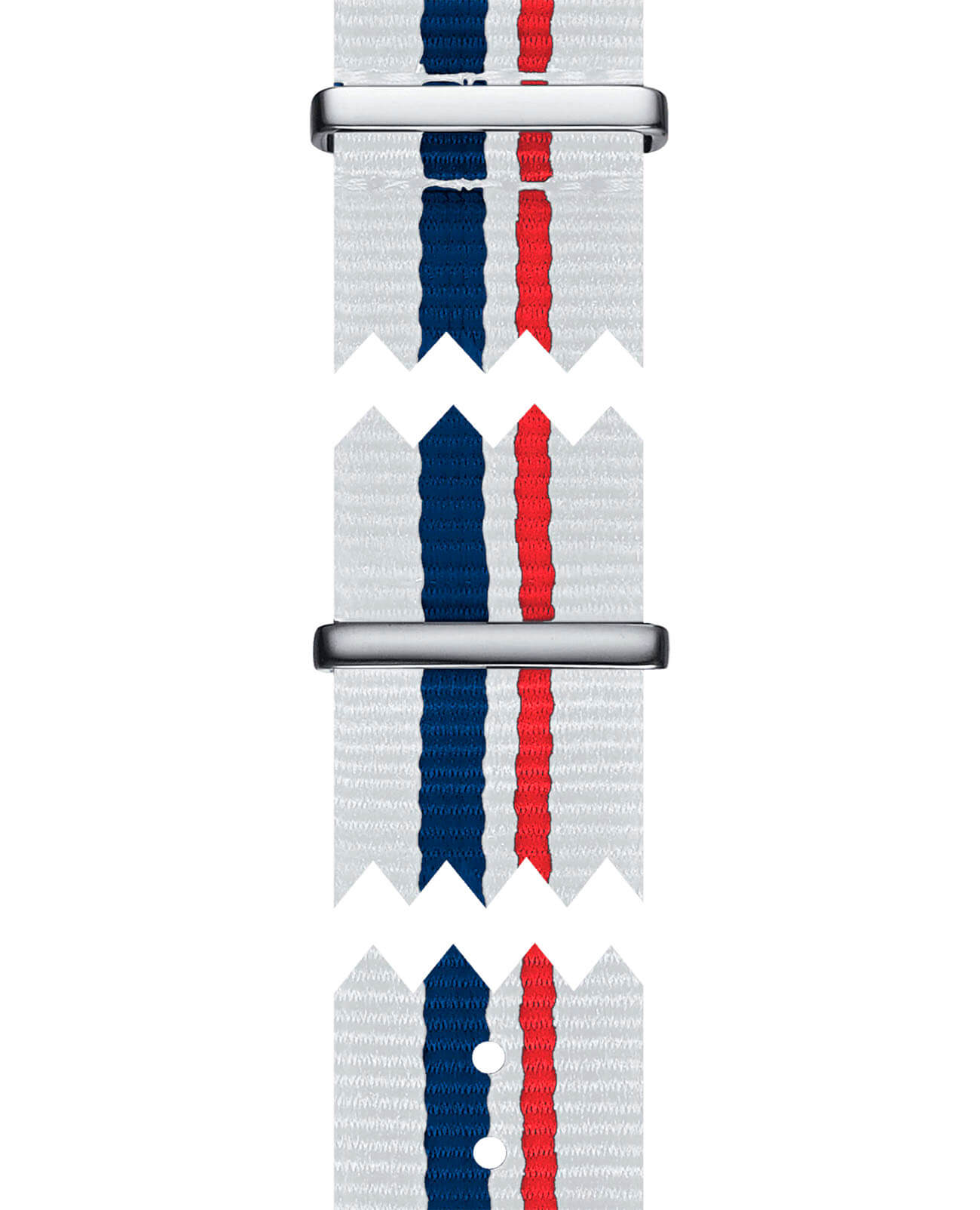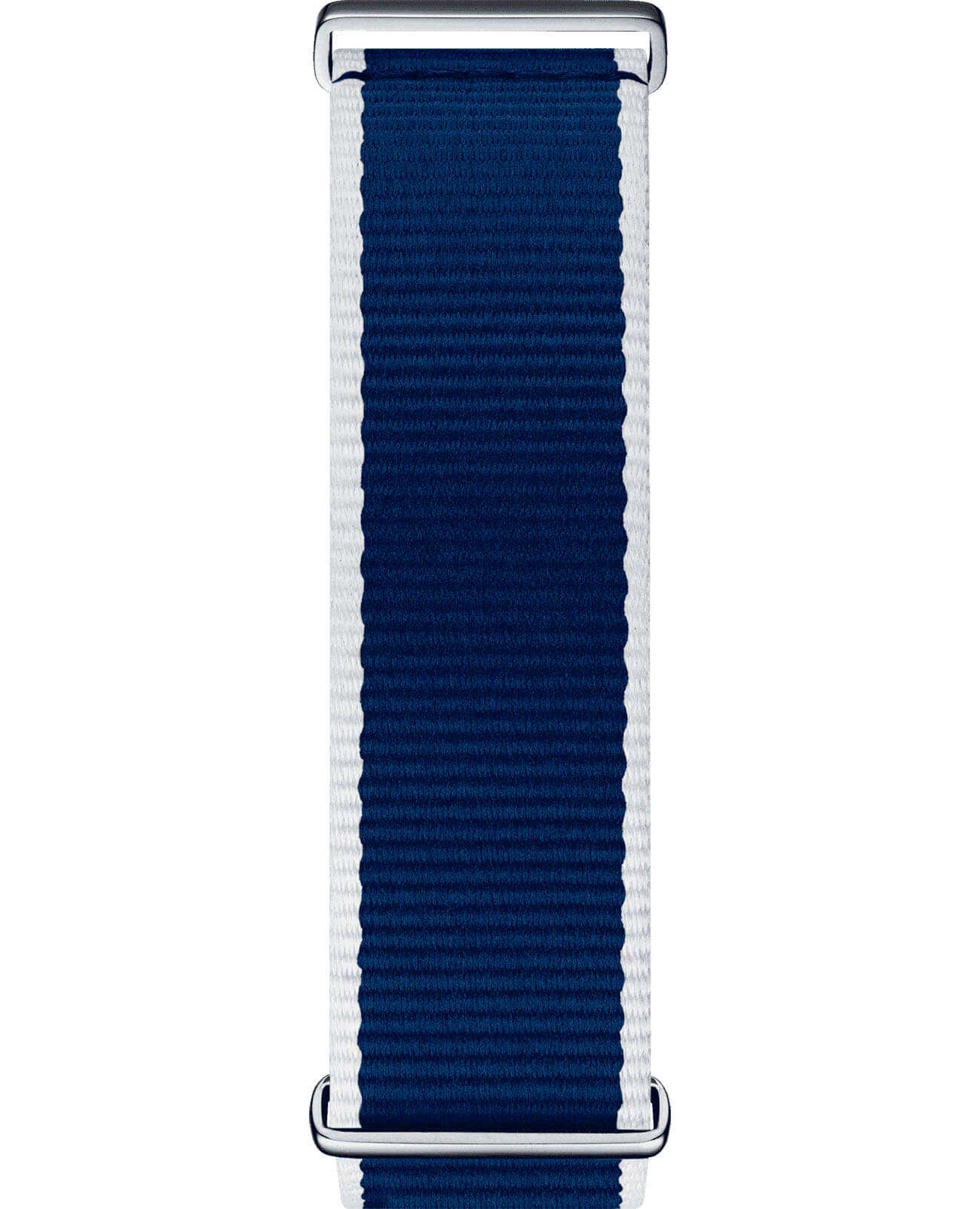 Белый циферблат идеально сочетается с ярким безелемБезельВнешний ободок, закрепляющий стекло. В спортивных часах так называется поворотное кольцо с делениями на циферблате, выполняет роль таймера – замеряет отрезки времени на шкале. Неподвижный безель – элемент декора. Однонаправленно вращающийся безель на дайверских часах позволяет фиксировать моменты погружения и выныривания на поверхность. с PVD-покрытиемPVDУльтратонкое покрытие наносится в технике вакуумного напыления, сочетает в себе нитрид титана особой прочности со слоем золота или оксида хрома. Несёт в себе декоративную или защитную функцию. насыщенно-синего цвета. Оригинально выглядит тканевый ремешок NATO белого цвета, украшенный волнами синего и красного оттенка. Такой материал обеспечивает максимальный комфорт при ношении и отличается лёгкостью. Высокая точность хода обеспечивается кварцевым механизмом ETA G10.211. Стекло из сапфира. Класс водозащиты WR 100. ХронографХронографФункция позволяет измерять отрезки времени с особой точностью: часы, минуты, секунды. Верным признаком хронографа является наличие на циферблате 3 дополнительных окошек-счётчиков., секундомер, индикация текущего числа, тахиметрТахиметрРазмеченная шкала, располагается на ободке или безеле часов. Тахиметр позволяет рассчитать скорость на определённом участке пути, расстояние измеряется в километрах или милях.. Габариты: 42 x 42 x 10,7 мм.