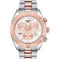 Спортивные элементы дизайна переплетаются с классическими, весьма женственно выглядят нежно-розовые счётчики и стрелки. Модель и центральный ряд звеньев браслета имеют PVD-покрытиеPVDУльтратонкое покрытие наносится в технике вакуумного напыления, сочетает в себе нитрид титана особой прочности со слоем золота или оксида хрома. Несёт в себе декоративную или защитную функцию. корпуса в цвете розового золота. Кварцевый калибр ETA G15.212 обеспечивает высокую точность хода. Водонепроницаемость при давлении 10 бар. Безопасная застёжка не допустит случайное расстёгивание браслета. Окошко даты, секундомер. Габариты: 38 x 38 x 10,5 мм.