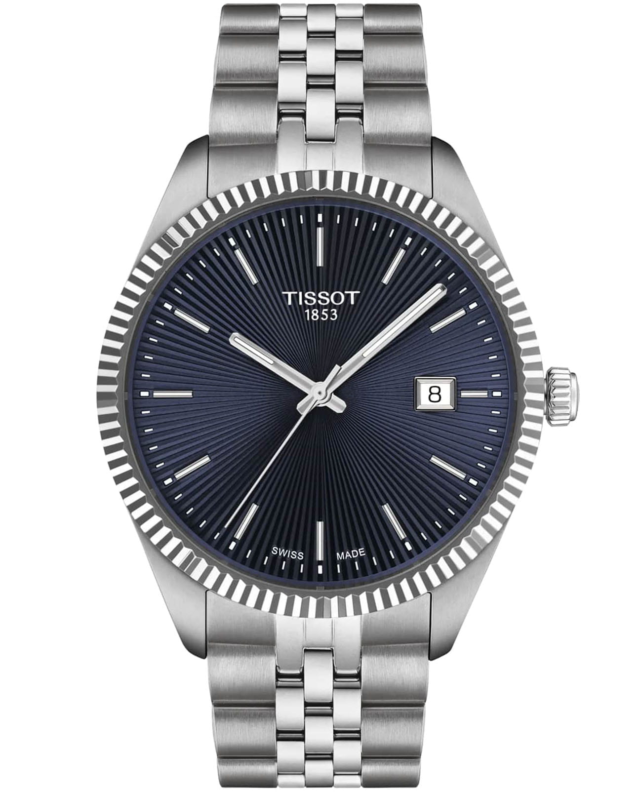 Часы Tissot Ballade 40 мм T156.410.11.041.00 сочетают классический дизайн с современными технологиями. Корпус диаметром 40 мм выполнен из нержавеющей стали 316L и оснащён рифлёным безелем, придающим часам элегантный вид. Глубокий синий циферблат защищён выпуклым сапфировым стекломСапфировое стеклоПрочный и надёжный материал из кристалла сапфира синтетического происхождения, характеризующийся особой твёрдостью и устойчивостью к царапинам и повреждениям. с антибликовым покрытием, обеспечивающим стойкость к царапинам и отличную читаемость.