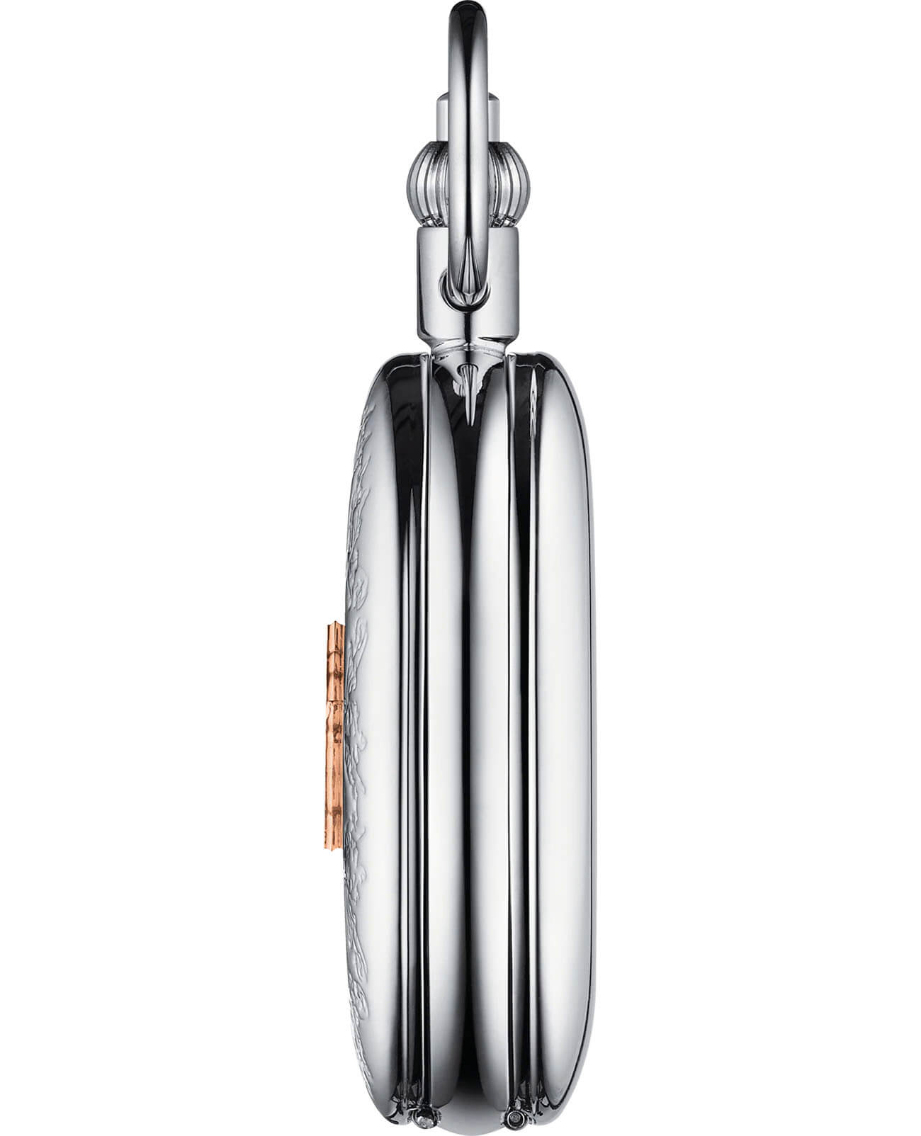 Модель имеет лёгкий ностальгический оттенок, крышка дополнена узнаваемым логотипом. Серебристый циферблат дополнен римскими цифрами, привлекательно смотрятся акценты цвета розового золота. Контрастные ажурные стрелки – отдельное произведение искусства. Это механические часы с ручным заводом, что необходимо делать регулярно. Они оснащены швейцарским пружинным механизмом ETA 6498-1, запас хода рассчитан на 46 часов. Калибр скрывается внутри корпуса из гипоаллергенной латуни с палладиевым покрытием. Используется 2 вида стекла – минеральное и хезалитовое. Часы поставляются в комплекте с цепочкой. Диаметр корпуса: 49,8 мм.