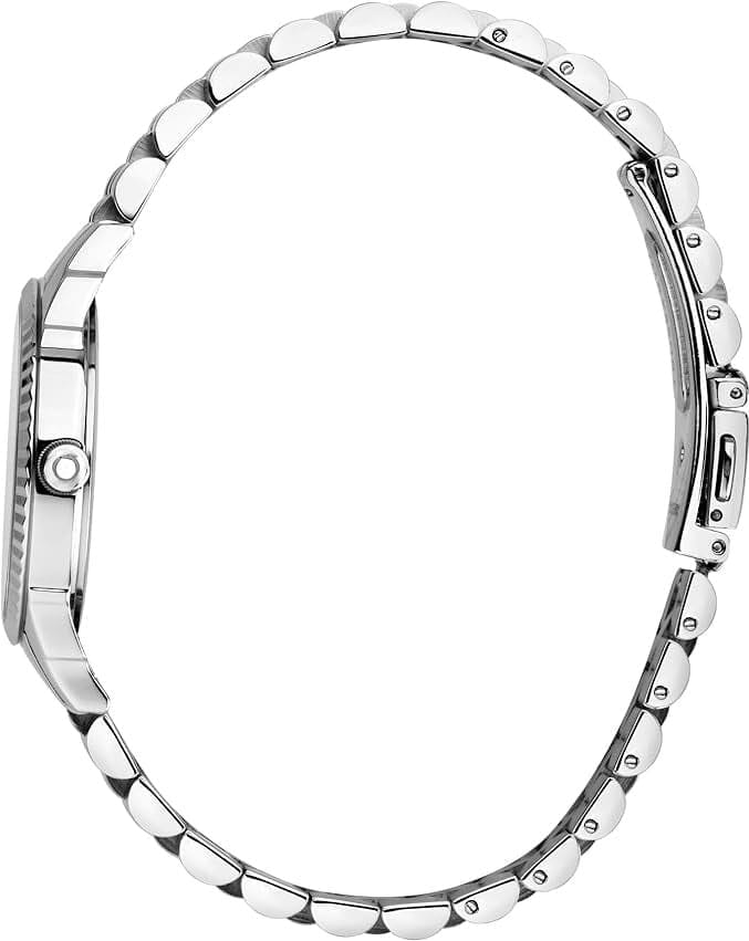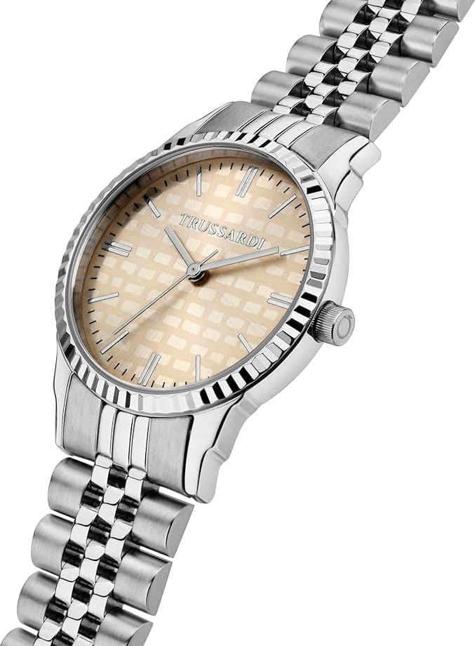 Итальянские женские часы Trussardi T-Bent R2453144512 - это стильный женский аксессуар, который сочетает элегантный дизайн и практичность. Корпус выполнен из нержавеющей стали, что обеспечивает долговечность и утончённый внешний вид. БезельБезельВнешний ободок, закрепляющий стекло. В спортивных часах так называется поворотное кольцо с делениями на циферблате, выполняет роль таймера – замеряет отрезки времени на шкале. Неподвижный безель – элемент декора. Однонаправленно вращающийся безель на дайверских часах позволяет фиксировать моменты погружения и выныривания на поверхность. с алмазной гранью. Надежное минеральное стеклоМинеральное стеклоМинеральное стекло представляет собой искусственно выращенный минерал кварца. Такое стекло отличается особой устойчивостью к повреждениям и царапинам. Уступает по некоторым качествам сапфировому стеклу. защищает циферблат от царапин и обеспечивает долговечность. Модель оснащена кварцевым механизмом, обеспечивающим высокую точность хода. Браслет из нержавеющей стали на раскладной застёжкеРаскладная застёжкаТакой тип застёжки используется только на браслетах из металла. Она никогда не раскрывается полностью, происходит разделение на 2 и более частей. Раскладывающая застёжка снизит вероятность потери часов к минимуму. обеспечивает комфортное ношение. Водозащита 50 метров позволит защитить корпус от случайных брызг или капель дождя. Эта модель – отличный выбор для тех, кто ищет сочетание стиля, качества и функциональности. Часы станут не только полезным аксессуаром, но и выразительным элементом вашего имиджа.