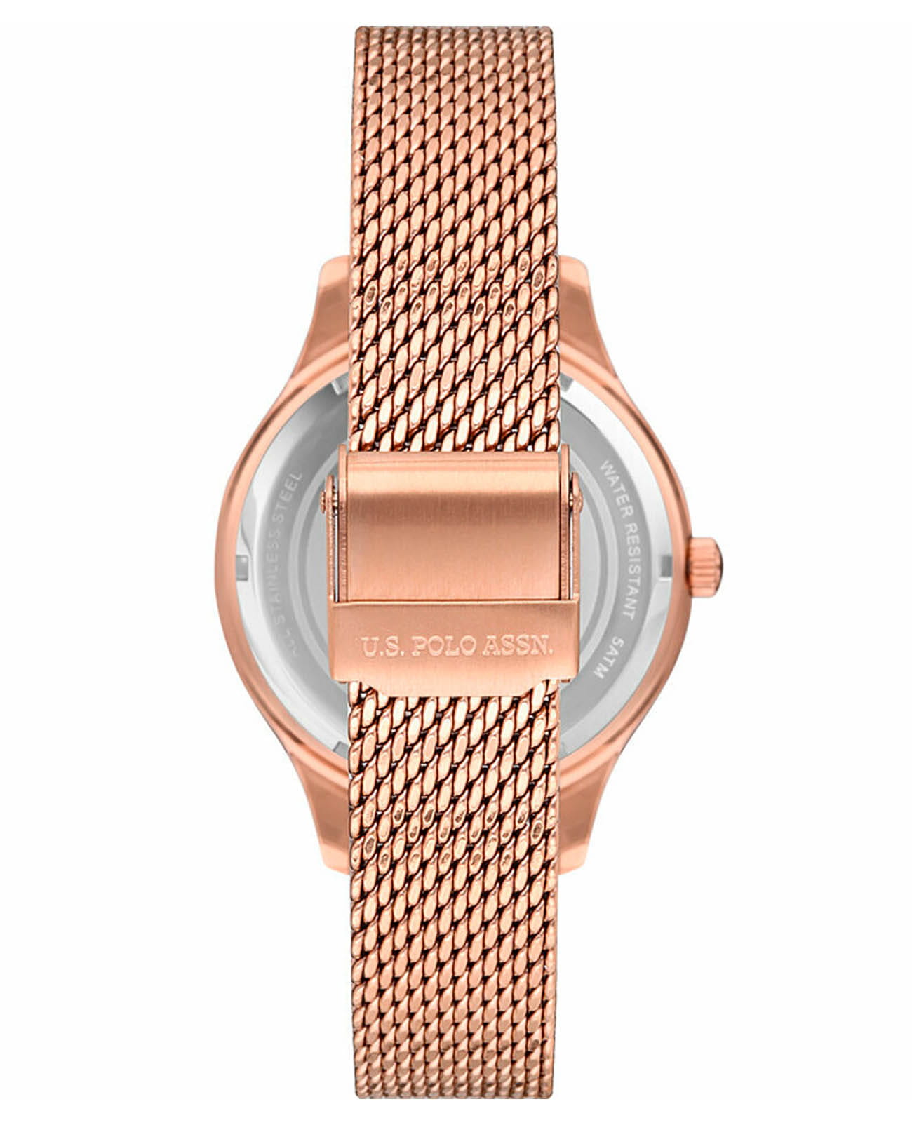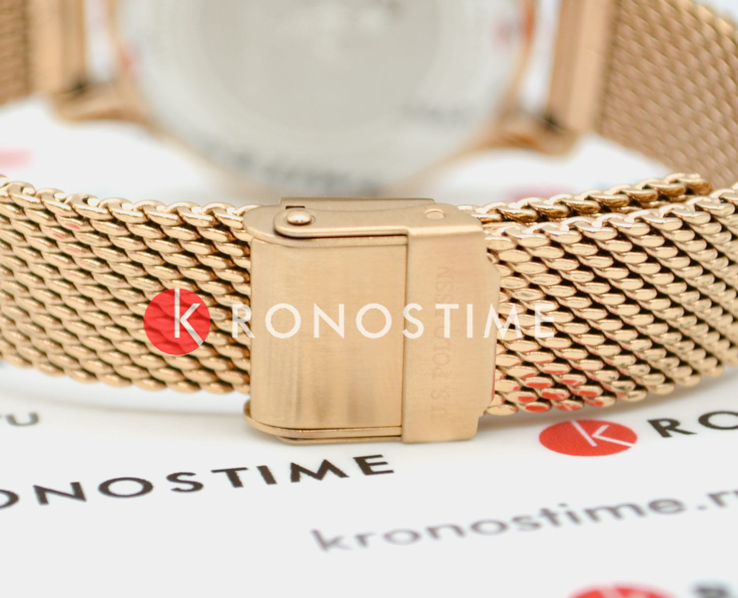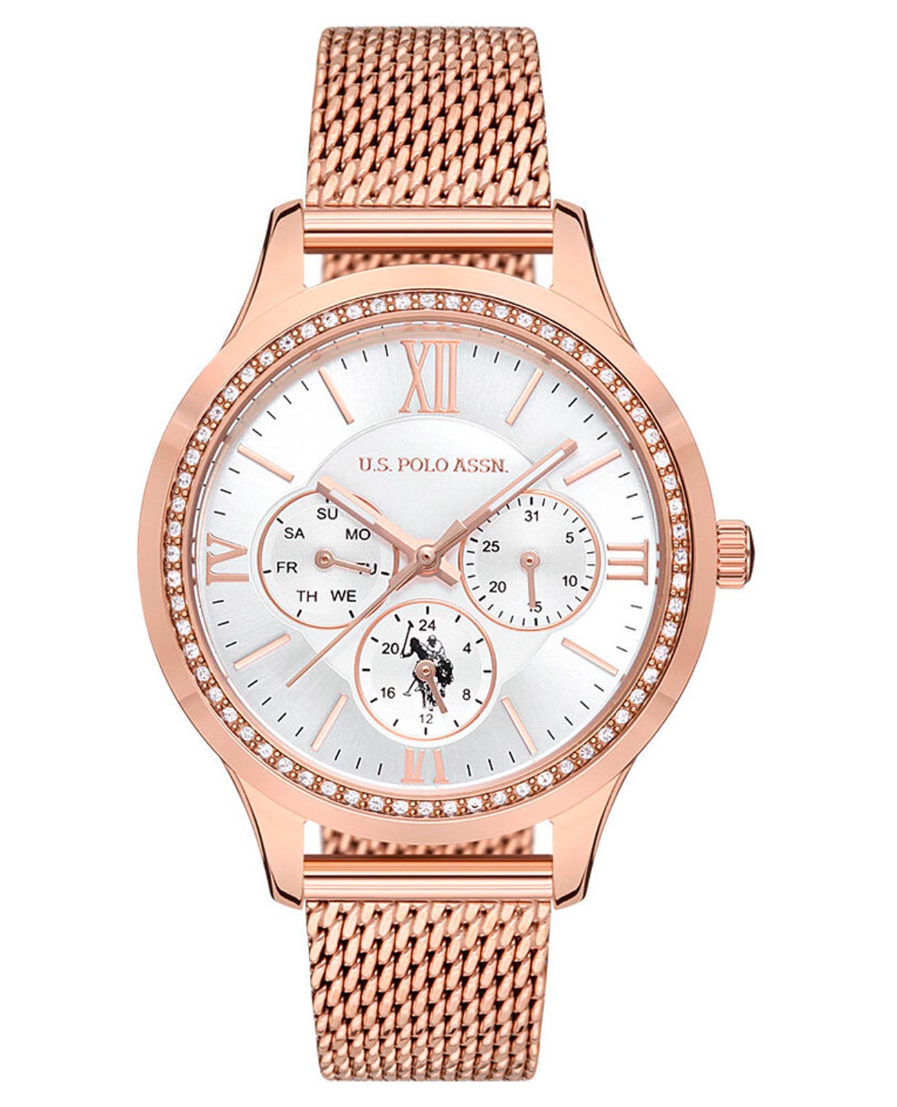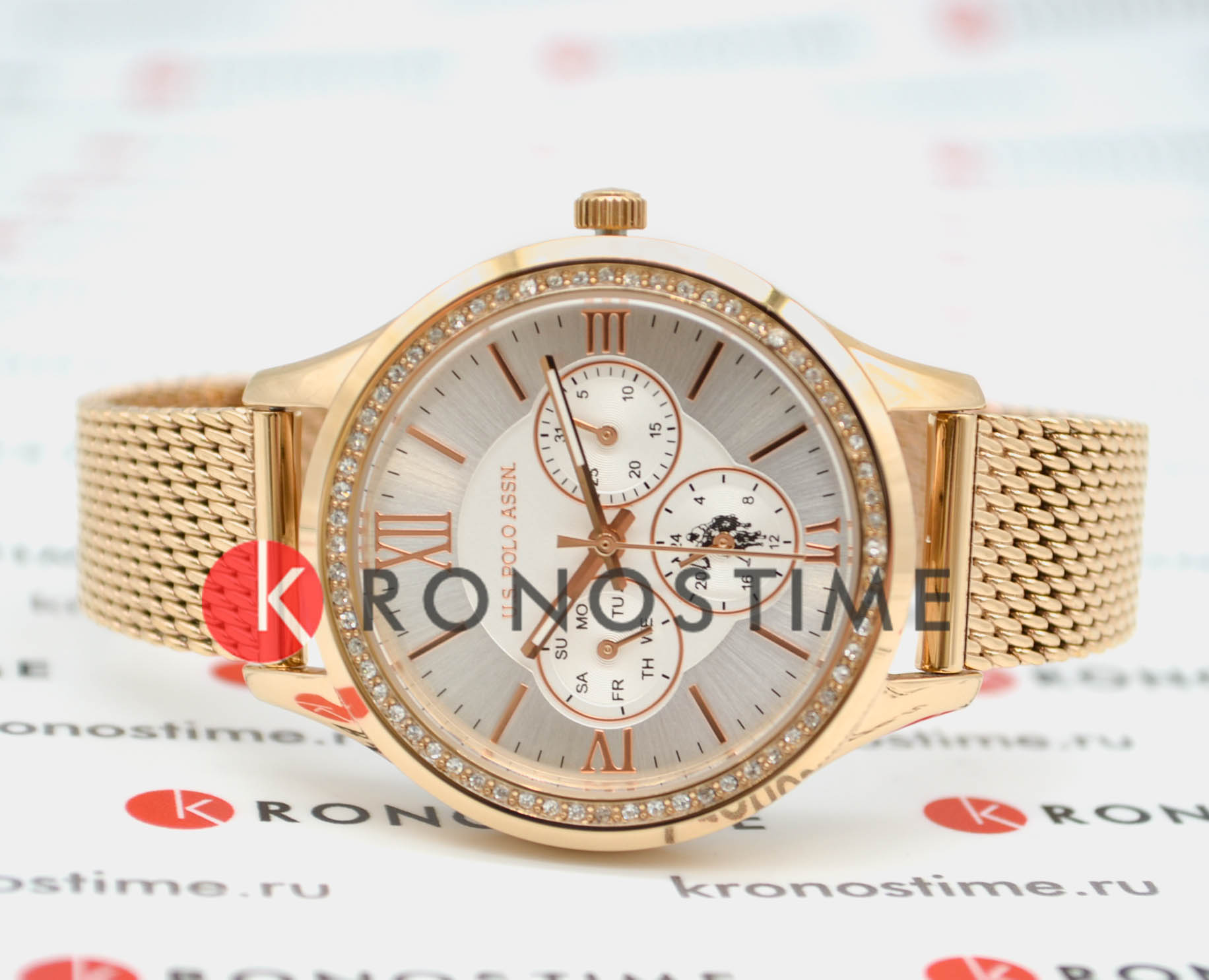 Женские часы U.S. Polo Assn. Stile USPA2022-01, кварцевый механизм с высокой точностью. Минеральное стеклоМинеральное стеклоМинеральное стекло представляет собой искусственно выращенный минерал кварца. Такое стекло отличается особой устойчивостью к повреждениям и царапинам. Уступает по некоторым качествам сапфировому стеклу. устойчивое к появлению царапин, обладающее высокой прозрачностью. Центральные часовая, минутная и секундная стрелки. Индикация даты и дня недели. 12/24х часовой формат времени. Корпус и браслет изготовлены из нержавеющей стали с IP-покрытиемIP-покрытиеМетод ионного напыления. Демонстрирует повышенную устойчивость к истиранию, окислению и химическим веществам. Под воздействием высокого давления и температуры около 1500°C молекулы металла надёжно соединяются с частицами корпуса часов.. На циферблате три дополнительных индикатора. Стрелки с люминесцентным покрытиемЛюминесцентное покрытиеПозволяет считывать показания времени в темноте. Производители наносят на стрелки, часовые индексы, безель или поверхность циферблата светонакопительный состав, дающий холодное свечение.. Часы украшены кристаллами. Класс водозащиты: 50 метров, позволит защитить корпус от случайных брызг или капель дождя. Стальной браслет миланского плетения на раскладном замкеРаскладной замокДанный вариант застежки используется только на часах с металлическим браслетом. Отличительная особенность такого крепления в том, что длина браслета становится универсальной и вы можете самостоятельно отрегулировать нужный вам размер – застежка просто двигается по браслету часов..