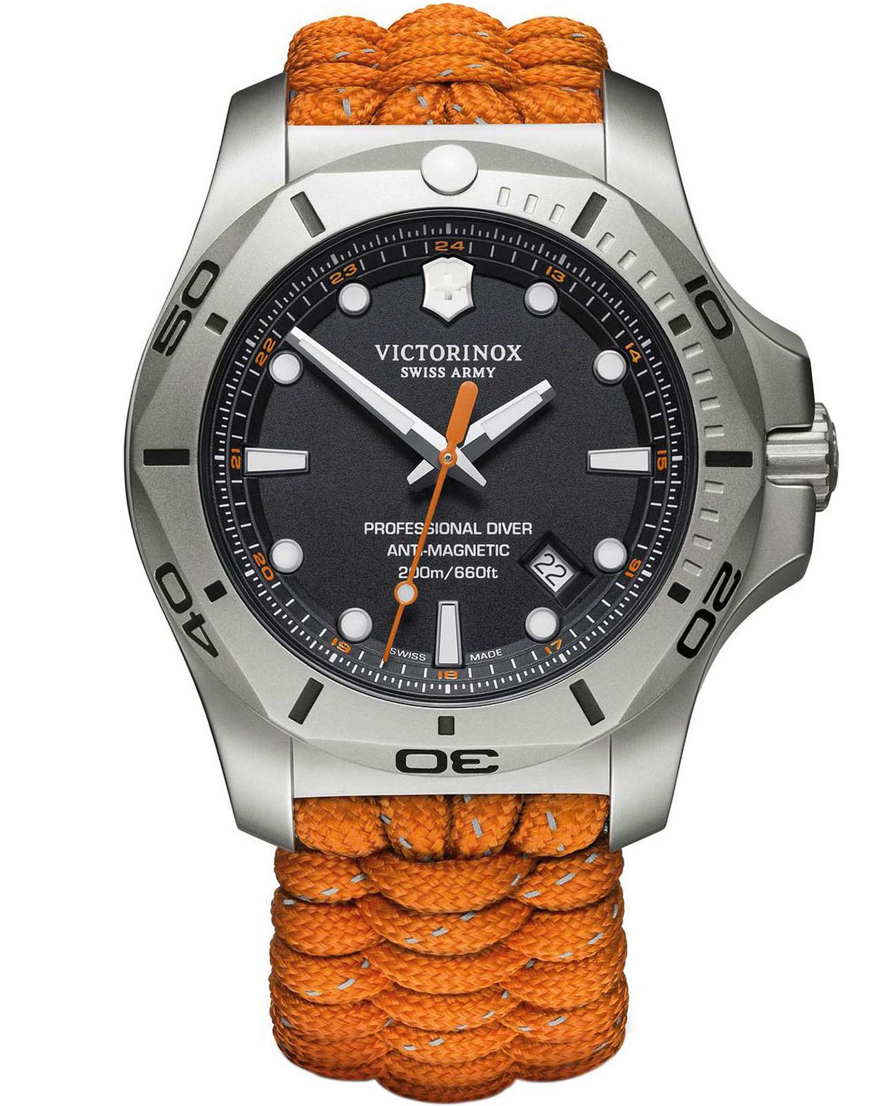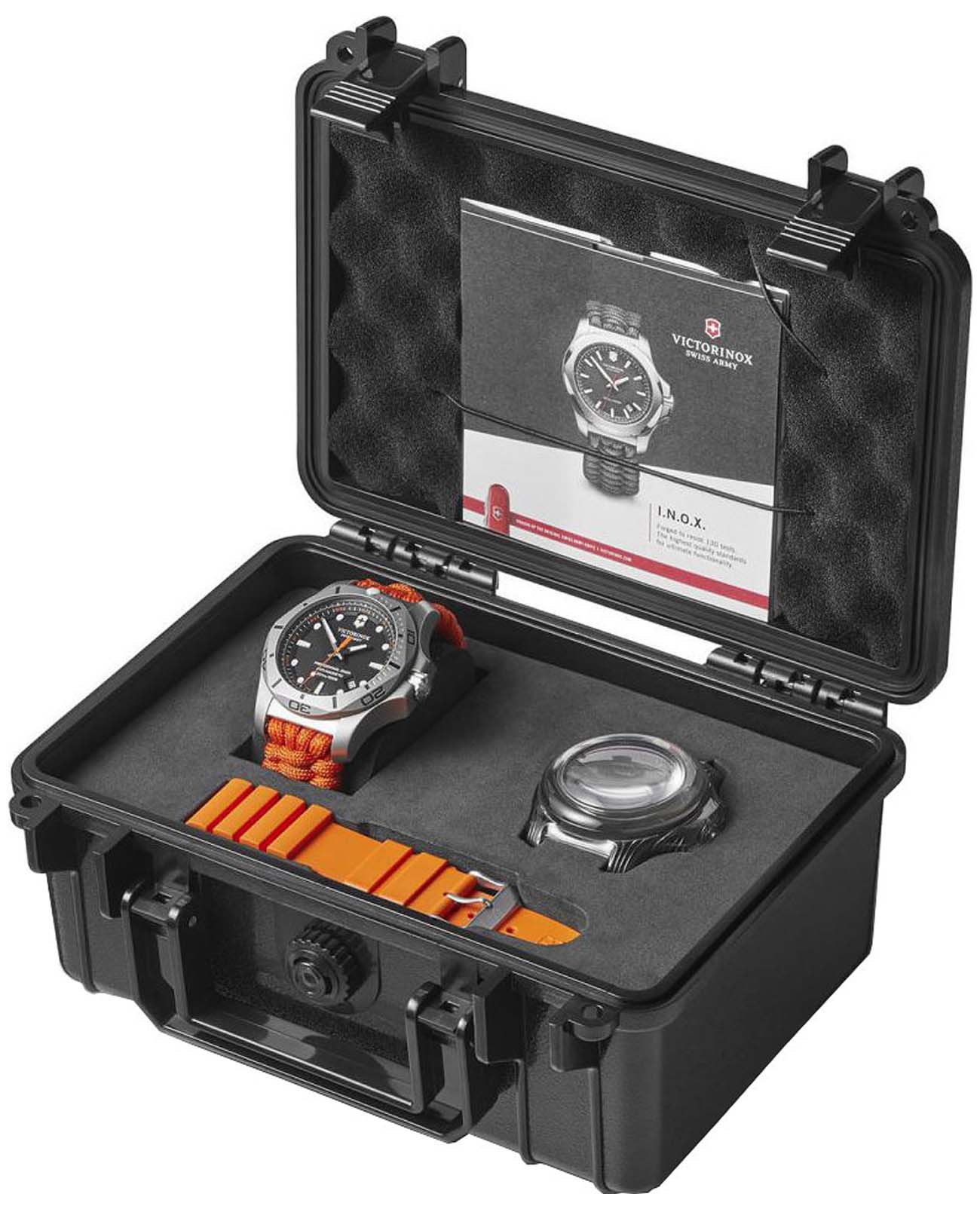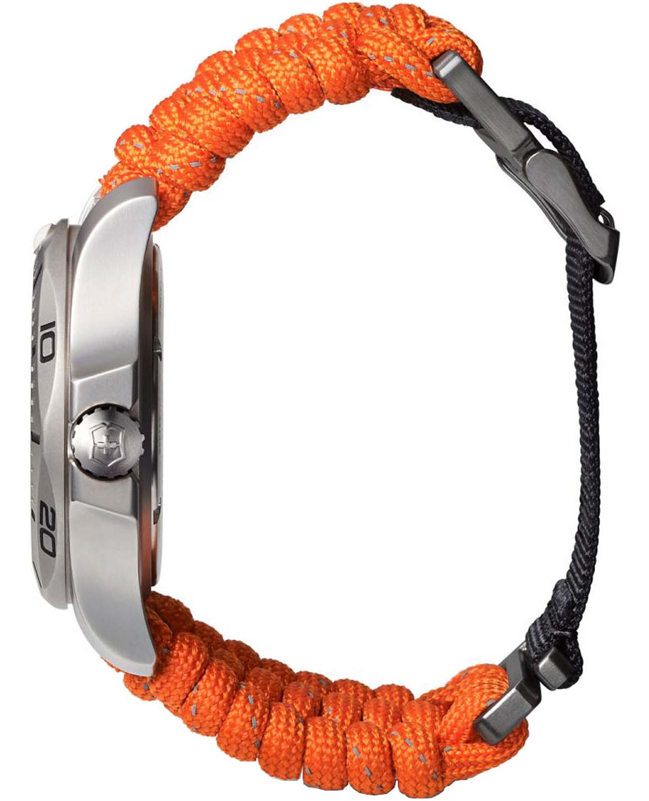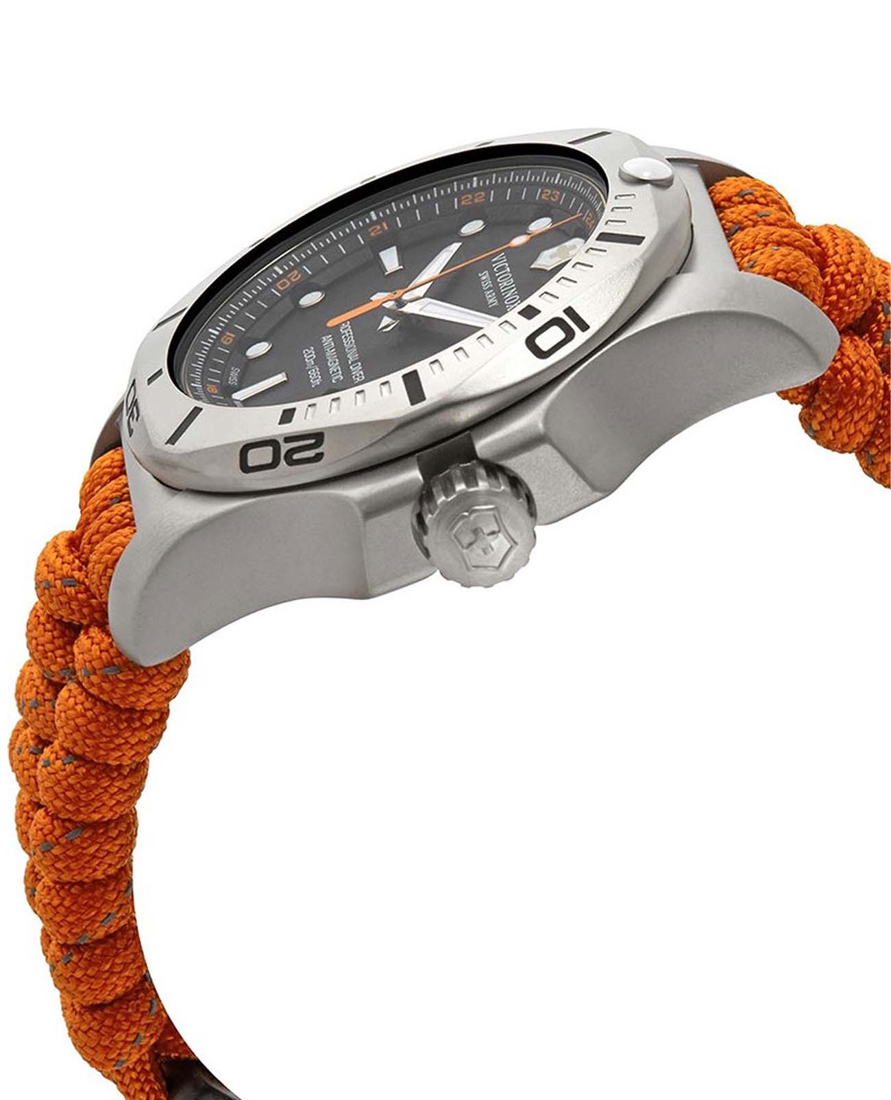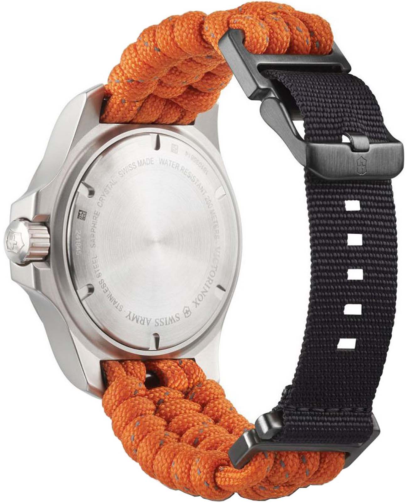 Мужские швейцарские часы Victorinox I.N.O.X. Professional Diver 241845. Сапфировое стеклоСапфировое стеклоПрочный и надёжный материал из кристалла сапфира синтетического происхождения, характеризующийся особой твёрдостью и устойчивостью к царапинам и повреждениям. с трёхслойным антибликовым покрытием. Корпус часов выполнен из карбона. Ремешок изготовлен из плетенной паракордовой стропы, длиной 2,5 метра и способной выдержать 250 кг. Влагозащита: 200 метров, позволит плавать, нырять и заниматься другими водными видами спорта. Окошко даты находится в положении между 4 и 5 часов. Стрелки и метки с люминесцентным покрытиемЛюминесцентное покрытиеПозволяет считывать показания времени в темноте. Производители наносят на стрелки, часовые индексы, безель или поверхность циферблата светонакопительный состав, дающий холодное свечение.. В комплекте съемный защитный бампер с увеличительным стеклом и резиновый ремешок.