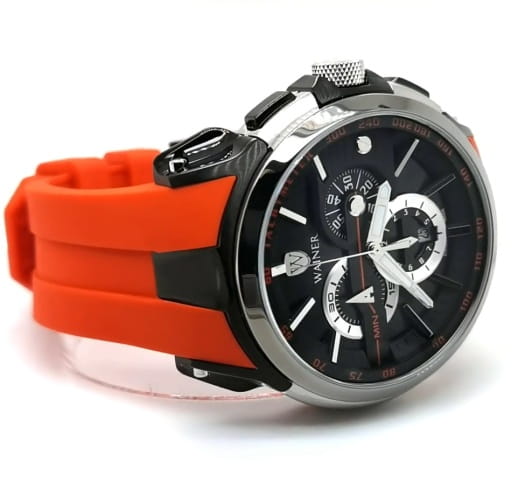 Швейцарские мужские кварцевые часы-хронограф Wainer Trio WA.16910-K с механизмом калибра Ronda 5030 созданы для любителей современного спортивного стиля. Часы оснащены широким набором функций, включая секундомер, тахиметр и вынесенную секундную стрелку. Круглый корпус из нержавеющей стали 316L с частичным PVD-покрытиемPVDУльтратонкое покрытие наносится в технике вакуумного напыления, сочетает в себе нитрид титана особой прочности со слоем золота или оксида хрома. Несёт в себе декоративную или защитную функцию. диаметром 47 мм и толщиной 13 мм защищен прочным сапфировым стекломСапфировое стеклоПрочный и надёжный материал из кристалла сапфира синтетического происхождения, характеризующийся особой твёрдостью и устойчивостью к царапинам и повреждениям.. Черный циферблат с метками в виде штрихов оснащен окошком даты в положении 6 часов. Стрелки с люминесцентным покрытиемЛюминесцентное покрытиеПозволяет считывать показания времени в темноте. Производители наносят на стрелки, часовые индексы, безель или поверхность циферблата светонакопительный состав, дающий холодное свечение. обеспечивают хорошую видимость в темное время суток. Рифленая заводная головка с защитой добавляет надежности модели. Часы имеют класс водозащиты 100 метров, позволит плавать, нырять и заниматься другими водными видами спорта. Модель комплектуется удобным силиконовым ремешком шириной 24 мм на стандартной застежке. Вес часов составляет 140 грамм, что обеспечивает комфортное ношение в течение дня.