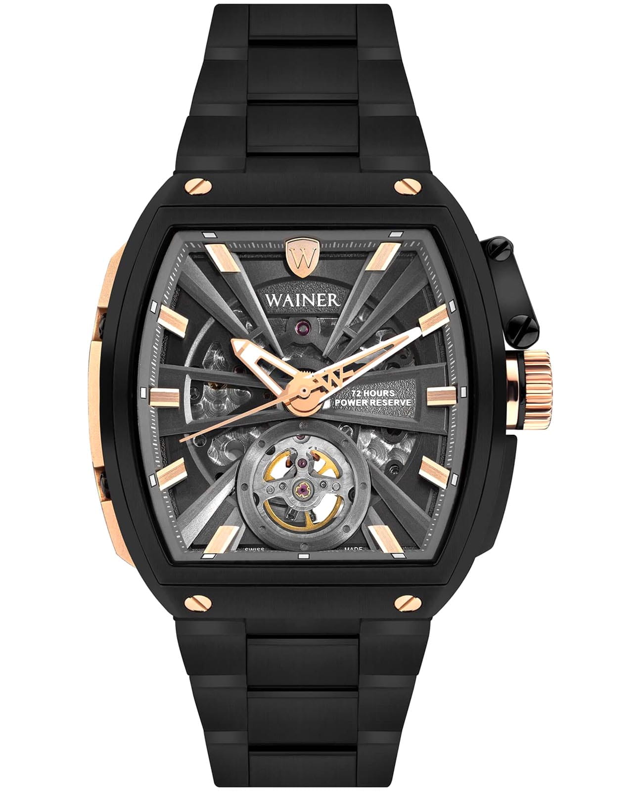 Мужские механические часы-скелетон с автоподзаводом Wainer WA.25150-B сочетает элегантный дизайн и высокое качество исполнения. Бочкообразный корпус выполнен из нержавеющей стали с PVD-покрытиемPVDУльтратонкое покрытие наносится в технике вакуумного напыления, сочетает в себе нитрид титана особой прочности со слоем золота или оксида хрома. Несёт в себе декоративную или защитную функцию. черного цвета, диаметром 46 х 47мм и толщиной 14 мм, обеспечивает прочность и долговечность. Циферблат с метками в виде штрихов и украшен фирменным логотипом Wainer. Сапфировое стеклоСапфировое стеклоПрочный и надёжный материал из кристалла сапфира синтетического происхождения, характеризующийся особой твёрдостью и устойчивостью к царапинам и повреждениям. защищает дисплей от царапин и механических повреждений. Стальной браслет с PVD-покрытиемPVDУльтратонкое покрытие наносится в технике вакуумного напыления, сочетает в себе нитрид титана особой прочности со слоем золота или оксида хрома. Несёт в себе декоративную или защитную функцию. на застёжке-бабочкеЗастёжка "бабочка"Такой вид застёжки дополняется предохранителями, помогающими избежать случайного раскрытия браслета. Обладают изящным исполнением. обеспечивает комфортное ношение. Водонепроницаемость до 30 метров позволит защитить корпус от случайных брызг или капель дождя. Рифленая заводная головка с защитой. Прозрачная задняя крышка. Стрелки с люминесцентным покрытиемЛюминесцентное покрытиеПозволяет считывать показания времени в темноте. Производители наносят на стрелки, часовые индексы, безель или поверхность циферблата светонакопительный состав, дающий холодное свечение., улучшая читаемость в условиях недостаточного освещения. Wainer — это стильный и надежный аксессуар для тех, кто ценит швейцарское качество и современные технологии.